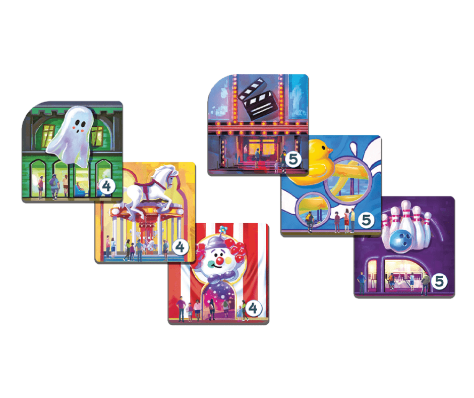 Durante la fase de Construcción pueden colocar sus fichas de Atracción en el tablero. Pueden poner tantas fichas como quieran, incluso ninguna. Mantengan las fichas que no construyan bocarriba, delante de ustedes, para las siguientes rondas. Solo pueden colocar sus fichas de Atracción en ubicaciones vacías que sean de su propiedad o ampliar sus atracciones añadiendo fichas idénticas en las ubicaciones adyacentes que sean de su propiedad.