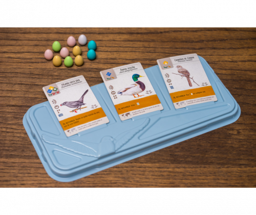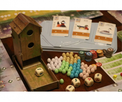 • Gana fichas de alimento con dados especiales que se lanzan en una torre de dados con forma de comedero de aves